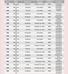 La zona metropolitana de Zacatecas y Guadalupe registró dos decesos; se trata de pacientes masculinos de 55 y 74 años, respectivamente. El primero de ellos era portador de hipertensión arterial y obesidad, mientras que el segundo padecía de diabetes.