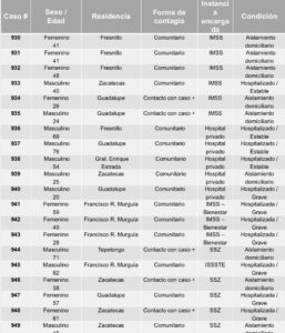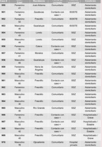 También en Fresnillo ocurrió el tercer deceso de estas últimas 24 horas; se trata de una mujer de 79 años, originaria de San José de Lourdes. Fue internada en el Hospital General de este municipio el 29 de junio; sin embargo, sus antecedentes de hipertensión complicaron severamente su recuperación.