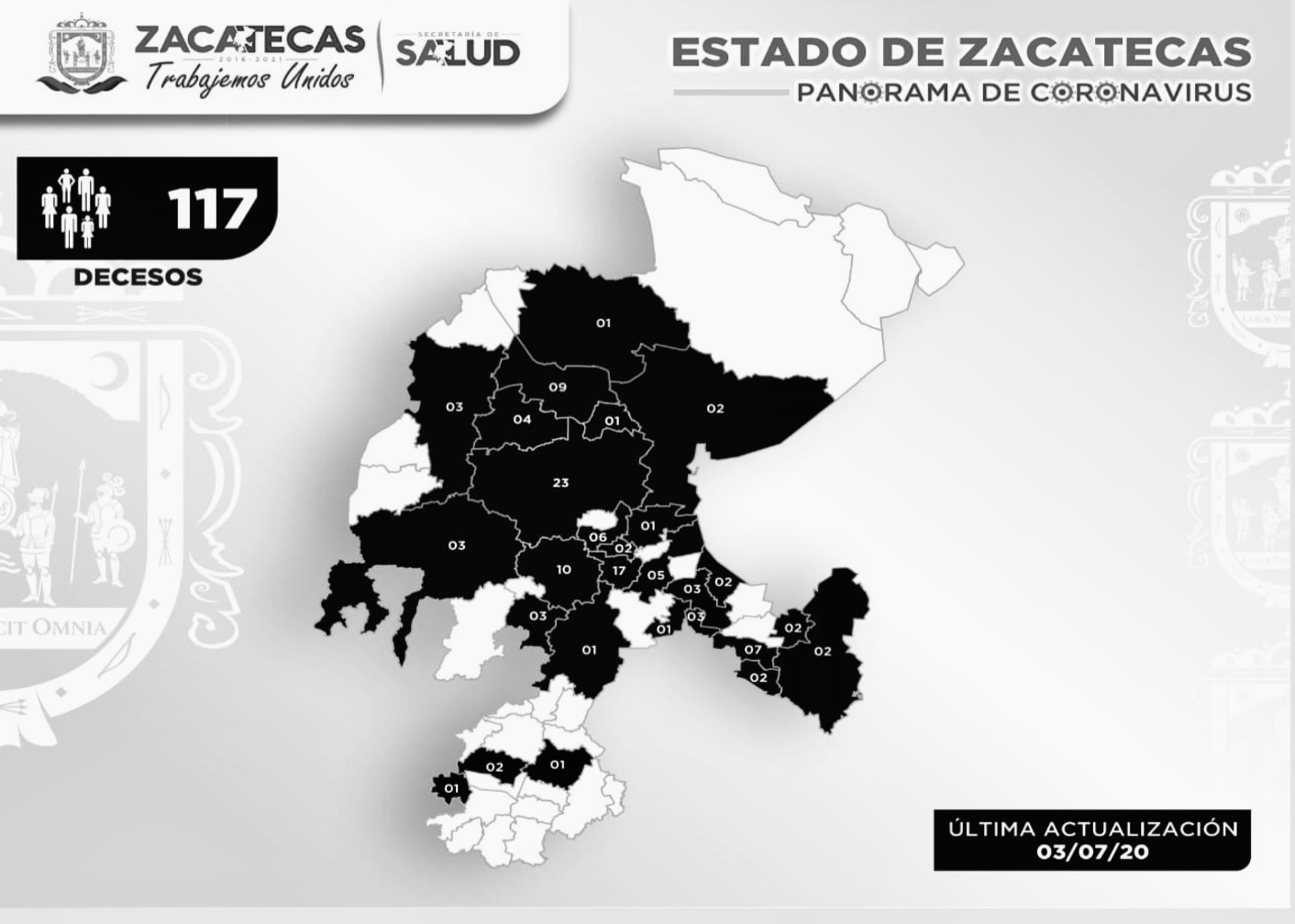 Zacatecas, Zac., 3 de julio de 2020.- Zacatecas registró tres nuevos decesos provocados por el virus SARS-CoV-2, que origina la enfermedad de Covid-19, por lo que ahora son 117 personas las que han perdido la vida a lo largo de esta pandemia.