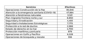 Como Fuerza Operativa este Instituto Armado mantiene un efectivo de 83,445 elementos, la Secretaría de Marina 30,865 y la Guardia Nacional 96,132, sumando un total de 210,441, de los cuales se encuentran desplegados 173,776 en los siguientes servicios: