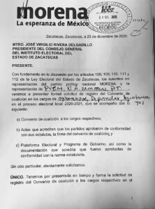 Zacatecas, Zac.- Ante el Instituto Electoral del Estado de Zacatecas (IEEZ) se registr贸 la solicitud de la coalici贸n Juntos Haremos Historia, conformada por los partidos MORENA, Verde Ecologista de M茅xico (PVEM), del Trabajo (PT) y Alianza Zacatecas, la cual buscar谩 la gubernatura de Zacatecas en las elecciones de 2021.