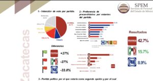 Referente al apartado de la intenci贸n del voto de los zacatecanos, Morena registra 42.7 por ciento de las preferencias ciudadanas; el PRI el 15.7; PAN 8.9; PRD 7.0 y MC 2.2 por ciento.