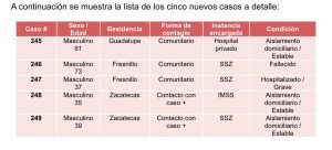 Zacatecas, Zac. 23 de mayo de 2020.- La cifra de casos positivos de Coronavirus (COVID-19) en Zacatecas se elev贸 249 al ser registrados otros cinco, la tarde de hoy, por parte del Sector Salud estatal.