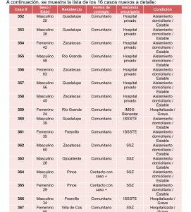 El segundo deceso corresponde a un hombre de 68 años de edad, residente de Zacatecas, derechohabiente del IMSS, registrado como el caso 310; su salud se complicó debido a que padecía diabetes, obesidad, así como enfermedad cardiovascular y pulmonar obstructiva; falleció a las 01:12 horas de hoy.