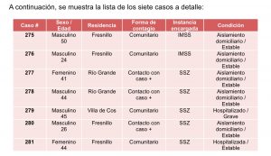 Zacatecas, Zac. 28 de mayo de 2020.- La cifra de casos positivos de Coronavirus (COVID-19) en el Estado de Zacatecas ya es de 281, luego de que el Sector Salud registr贸 siete nuevos esta tarde, seg煤n lo informado por Gilberto Bre帽a Cant煤, titular de la Secretar铆a de Salud en la entidad (SSZ).