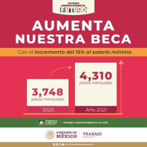 La beca del Programa Jóvenes Construyendo el Futuro (JCF) tendrá a partir del 13 de enero un incremento en su monto mensual y pasará de 3 mil 748 pesos a 4 mil 310 pesos mensuales, además el próximo lunes 11 de enero el Programa iniciará con la incorporación de nuevos beneficiarios, así lo informó la secretaria del Trabajo y Previsión Social, Luisa Alcalde Luján.