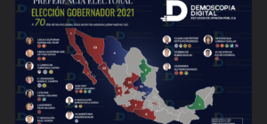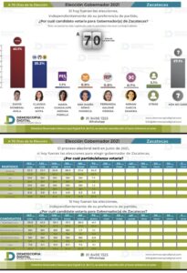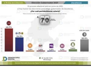En Zacatecas, apunta Demoscopía, Morena tiene una preferencia electoral del 45.7 por ciento; seguido más de 21 puntos atrás por la alianza Va por Zacatecas (PRI-PAN-PRD) con el 24.3.