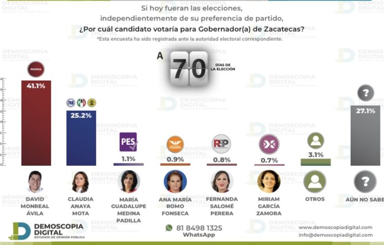 El estudio de opinión pública señala que a 70 días de la elección, David Monreal registra el 41.1 de las preferencias ciudadanas, al igual que el partido de Morena, quien tiene una preferencia del 45.7 por ciento entre los zacatecanos.