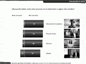 Otra parte de la encuesta realizada del 25 de enero al 2 de febrero de 2018, preguntó a los mexicanos sobre la intención de los spots, cuestionando sobre cada material si se trataba de un anuncio que informaba, donde se hacían propuestas, enfocado más a la crítica o si no decía nada.