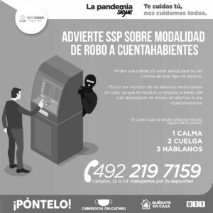Zacatecas, Zac.- La Secretaría de Seguridad Pública (SSP) solicita a la población zacatecana mantenerse alerta y evitar ser víctimas de las diversas modalidades de robo, ya que se reportó un engaño a través del cual despojaron de dinero en efectivo a una cuentahabiente.
