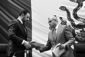 Ante Eduardo Rodríguez Ferrer, presidente de la Mesa Directiva de la Legislatura, y Arturo Nahle García, Magistrado Presidente del Tribunal Superior de Justicia del Estado de Zacatecas (TSJEZ), el Gobernador Alejandro Tello escuchó las intervenciones de los diputados representantes de las distintas fracciones parlamentarias.
