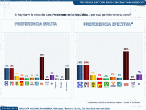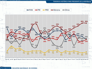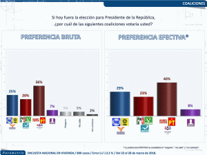 La serie histórica de preferencias electorales contemplando las alianzas muestra que de diciembre de 2017 a marzo de 2018 la preferencia electoral de Morena, PT y PES ha oscilado entre 39% y 42%. En tanto, la intención de voto por el PAN, PRD y MC ha descendido de 32% a 29% en el mismo lapso de tiempo. La alianza conformada por el PRI, PVEM y NA presenta mayores cambios, de diciembre a febrero se registró un descenso importante de 26% a 18% y de febrero a marzo de este año un repunte al pasar de 18% a 23%.