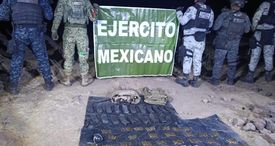 Villanueva, Zac., 4 enero de 2026.– Elementos del Ejército Mexicano, con el apoyo de la Fuerza de Reacción Inmediata Zacatecas (FRIZ) y la Guardia Nacional, aseguraron cartuchos, cargadores y artefactos explosivos, además de destruir campamentos utilizados por la delincuencia organizada, tras una agresión de civiles armados registrada en la comunidad Junta de los Ríos, municipio de Villanueva, sin que se reportaran personas lesionadas.