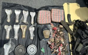 Al darles alcance y realzarles una inspección física, se detectó que se encontraban en posesión de nueve artefactos explosivos, 1 mil 470 cartuchos calibre .223, dos cargadores de disco, un chaleco balístico, siete cinturones tácticos, dos pares de rodilleras tácticas y 50 dosis de una sustancia granulada con características de la droga conocida como metanfetamina.
