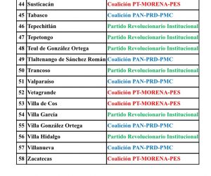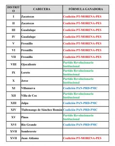 En 57 Consejos Municipales y 17 Consejos Distritales Electorales se entregaron las constancias de mayoría a las y los candidatos que resultaron triunfadores en la elección del domingo 1 de Julio. De acuerdo al resultado de los cómputos Distritales, la Coalición Juntos Haremos Historia que se integra con los Partidos Morena, PT y PES ganó en 8 Distritos; el partido Revolucionario Institucional en 5 Municipios, y la Coalición Por Zacatecas al Frente que integran los Partidos Políticos PAN, PRD y MC en 4 Distritos.