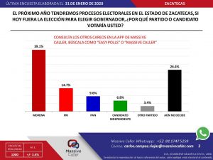 La empresa Massive Caller de Carlos Campos presentó hoy su medición mensual al 31 de enero del 2020 sobre la intención del voto para elegir gobernador en Zacatecas a través de una encuesta telefónica.