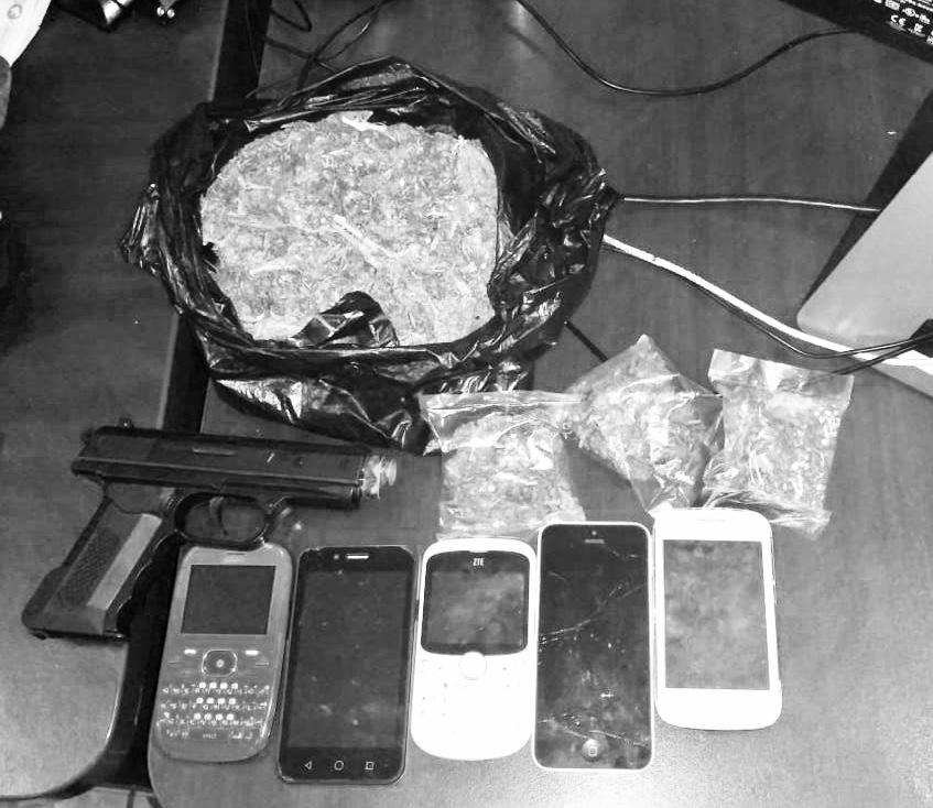 Asimismo, traía consigo cuatro bolsitas de plástico transparente, mismas que contenían enervante similar al de la otra bolsa; además, se le detectó entre sus ropas una pistola de plástico, tipo escuadra y color negro, así como cinco teléfonos celulares de diversas marcas