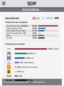En el caso de Zacatecas, Morena como partido tiene una preferencia del41.4 por ciento; PRI, 16.3 por ciento; PAN, 13 por ciento, MC, 2 por ciento y PRD, 1.7 por ciento.