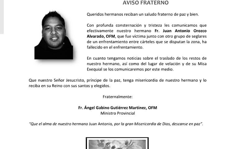 El religioso viajaba con un grupo de seglares cuando quedaron en un enfrentamiento entre miembros de dos cárteles que se disputan esta zona serrana.