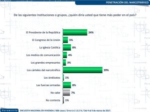Hay más mexicanos que consideran que los cárteles del narcotráfico tienen más poder que incluso el Presidente de la República. Cuatro de cada diez encuestados contestó que los cárteles del narcotráfico eran quienes detentaban más poder, la segunda opción con mayores respuestas fue el Presidente de República, con 24%? con 8% en tercer sitio se posicionó la Iglesia católica.
