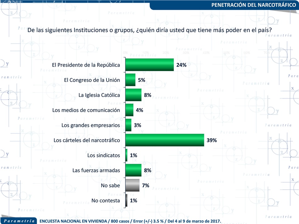 De acuerdo a una encuesta realizada por Parametría, la mayoría de los mexicanos considera que el narcotráfico es más poderoso que el propio Presidente de la República, las fuerzas armadas y la Iglesia Católica, y muy por arriba de los grandes empresarios, sindicatos o medios de comunicación. Hoy en día, el narcotráfico es el grupo más poderoso de México.