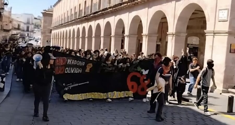 Zacatecas, Zac., 02 de octubre de 2025.- “¡2 de octubre no se olvida!”, resonó esta mañana por las calles de Zacatecas cuando cientos de estudiantes de la Universidad Autónoma de Zacatecas (UAZ) marcharon para recordar la matanza de Tlatelolco ocurrida en 1968. A 58 años de aquel episodio en el que la Plaza de las Tres Culturas se tiñó de sangre, los universitarios caminaron en memoria de quienes fueron asesinados por alzar la voz contra el autoritarismo.