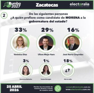 Este estudio ratifica una tendencia que ya otras mediciones sugerían: al interior de #Morena, Vero Díaz encabeza las preferencias con un 33% de aceptación, marcando una distancia frente a su competidor más cercano, Ulises Mejia Haro.