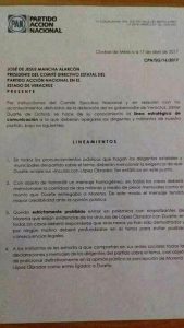 Si eres militante del PAN, como “línea estratégica de comunicación” debes aprovechar la detención de Javier Duarte y relacionarlo con AMLO, quedando estrictamente prohibido entrar en debate con algún militante de Morena que demande pruebas de esta aseveración, pide el Comité Ejecutivo Nacional del Partido Acción Nacional a sus cuadros.