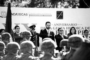 Tanto el Gobernador Tello, como el General Albazán Bertotto; el Magistrado Presidente del Tribunal Superior de Justicia, Armando Ávalos Arellano; la Presidenta Municipal, Judit Guerrero; el Presidente de la mesa directiva de la Legislatura de Zacatecas, Carlos Peña; la Secretaria General de Gobierno, Gilda Fabiola Torres, y otras autoridades, rindieron una guardia de honor a los seis héroes patrios que murieron en el Castillo de Chapultepec en una guerra que lidiaba este país con Estados Unidos.